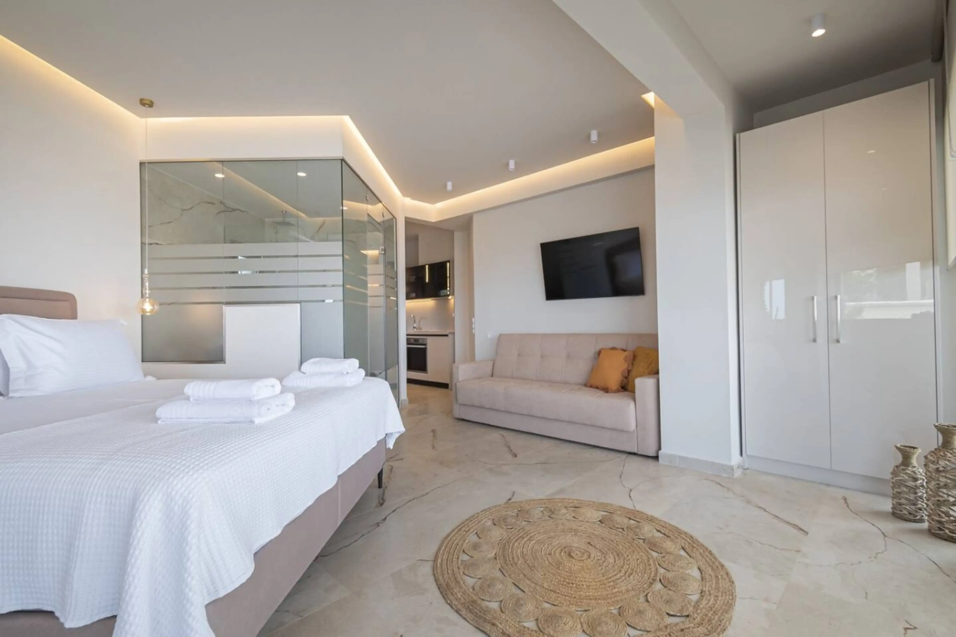 Althea Suites by Travel Pro Services are located in Nea Moudania, Halkidiki, in a privileged position, just a few steps from the beach of Nea Moudania. Each suite has two bedrooms, one with a double bed and the other with a bunk bed, a bathroom with a shower, a fully equipped kitchen, a living room ...